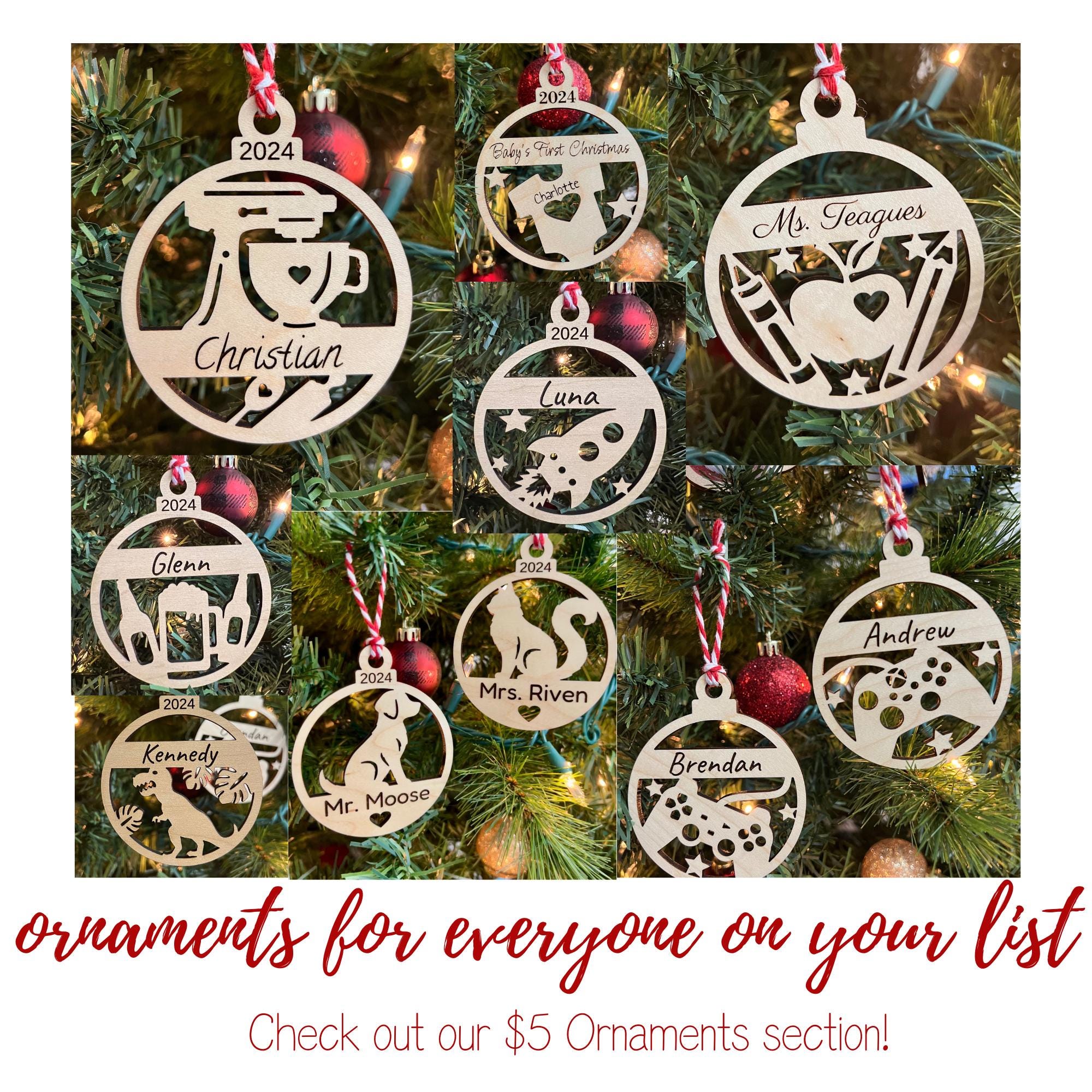 Wooden Cat or Dog Ornament, personalized with name. Makes a great gift tag turned keepsake ornament for your loved one. Measures 3.5h x 2.9w inches.