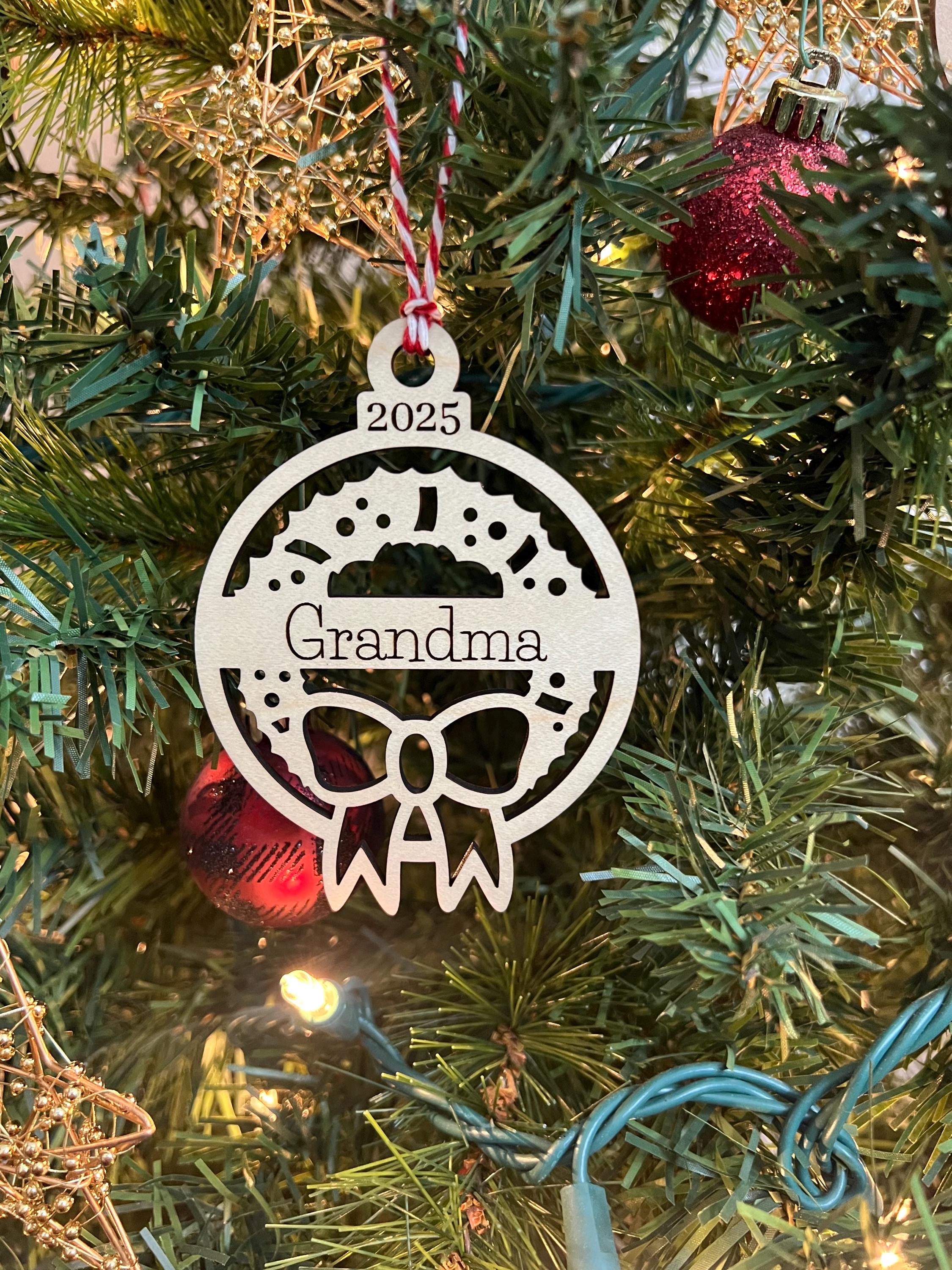 Wooden Personalized Christmas Wreath Ornament, personalized with name and year. Makes a great gift tag or stocking tag turned keepsake ornament for your loved one, friend, or coworker. Measures 3.5h x 2.9w inches.