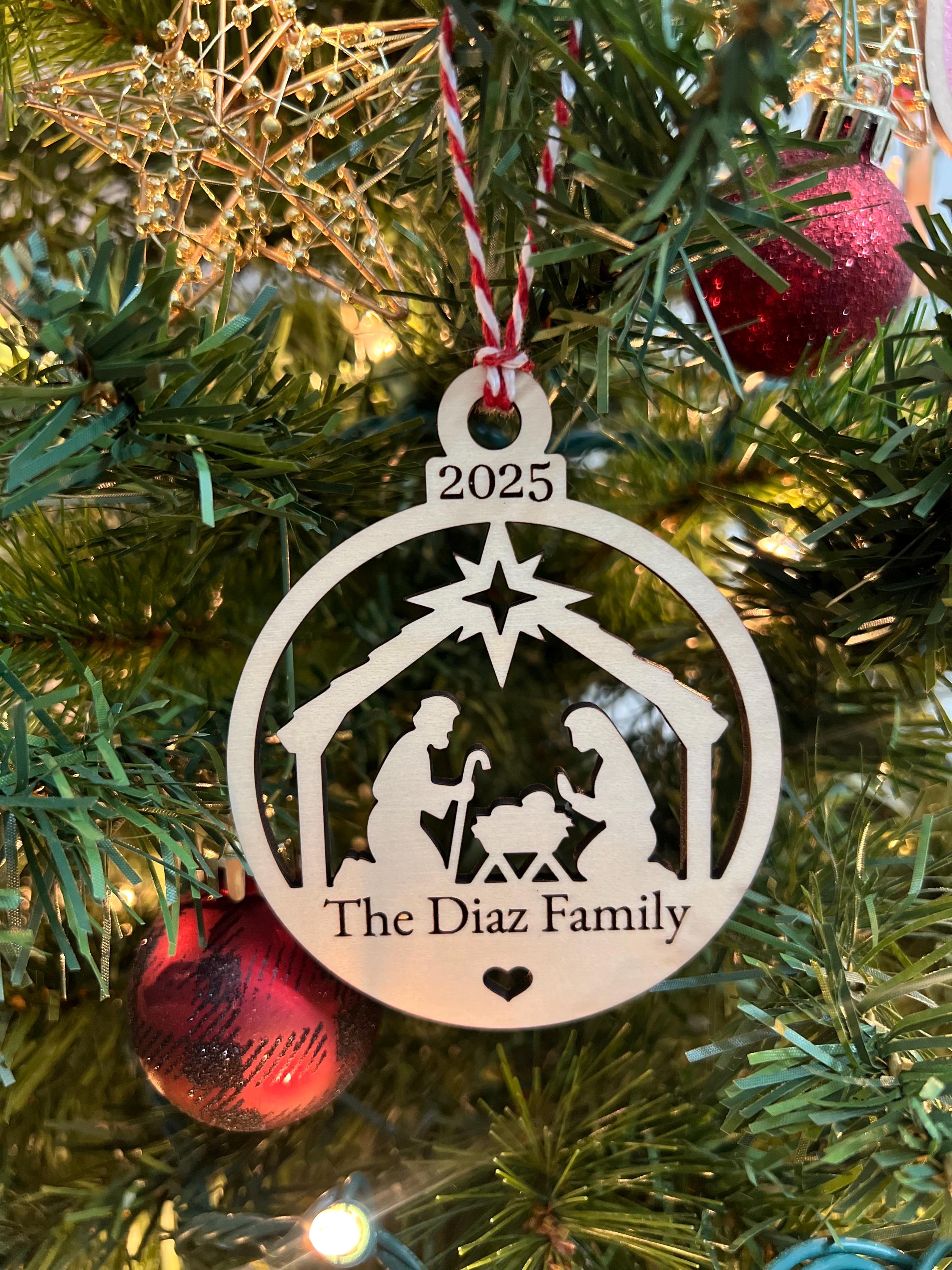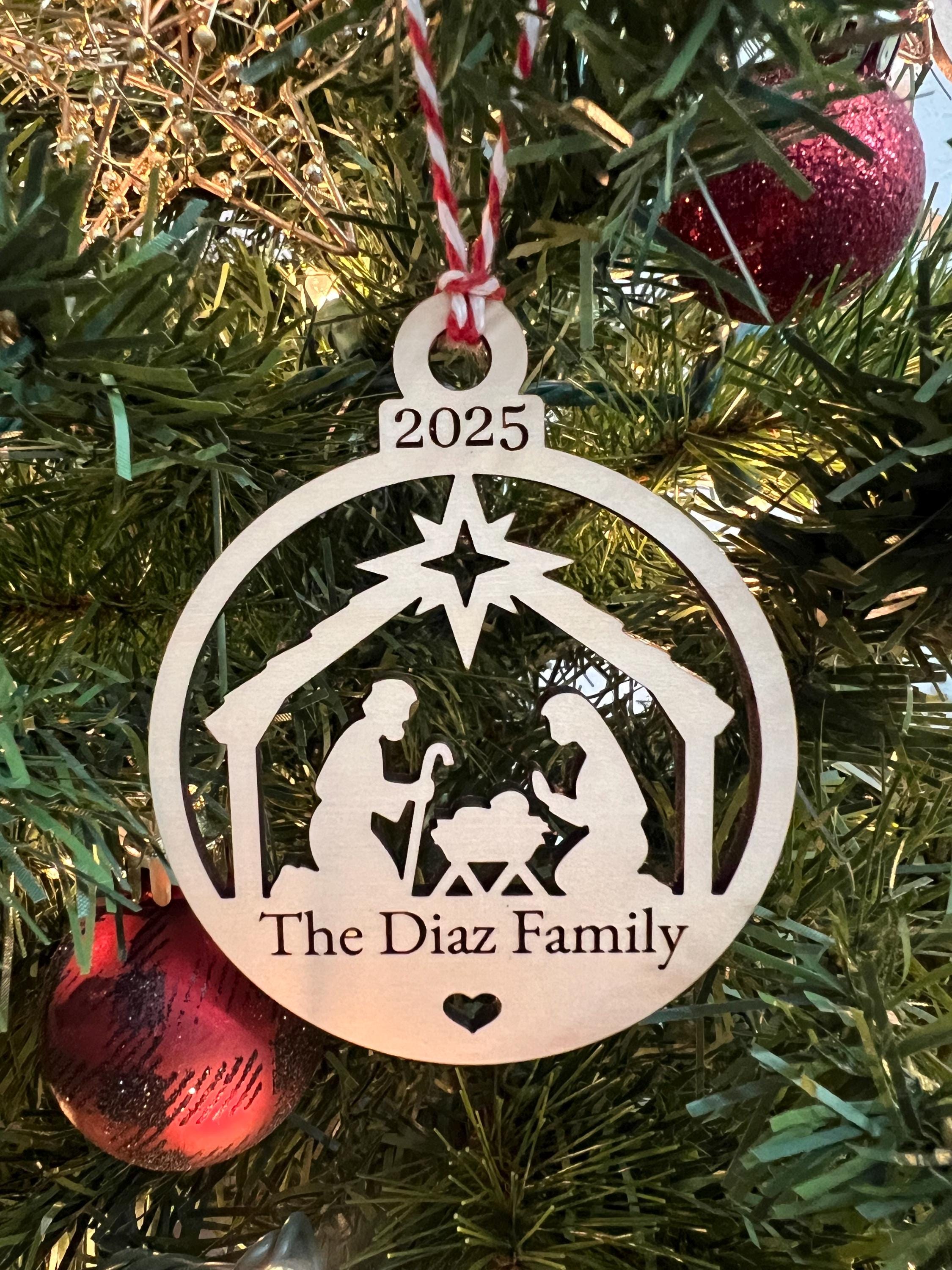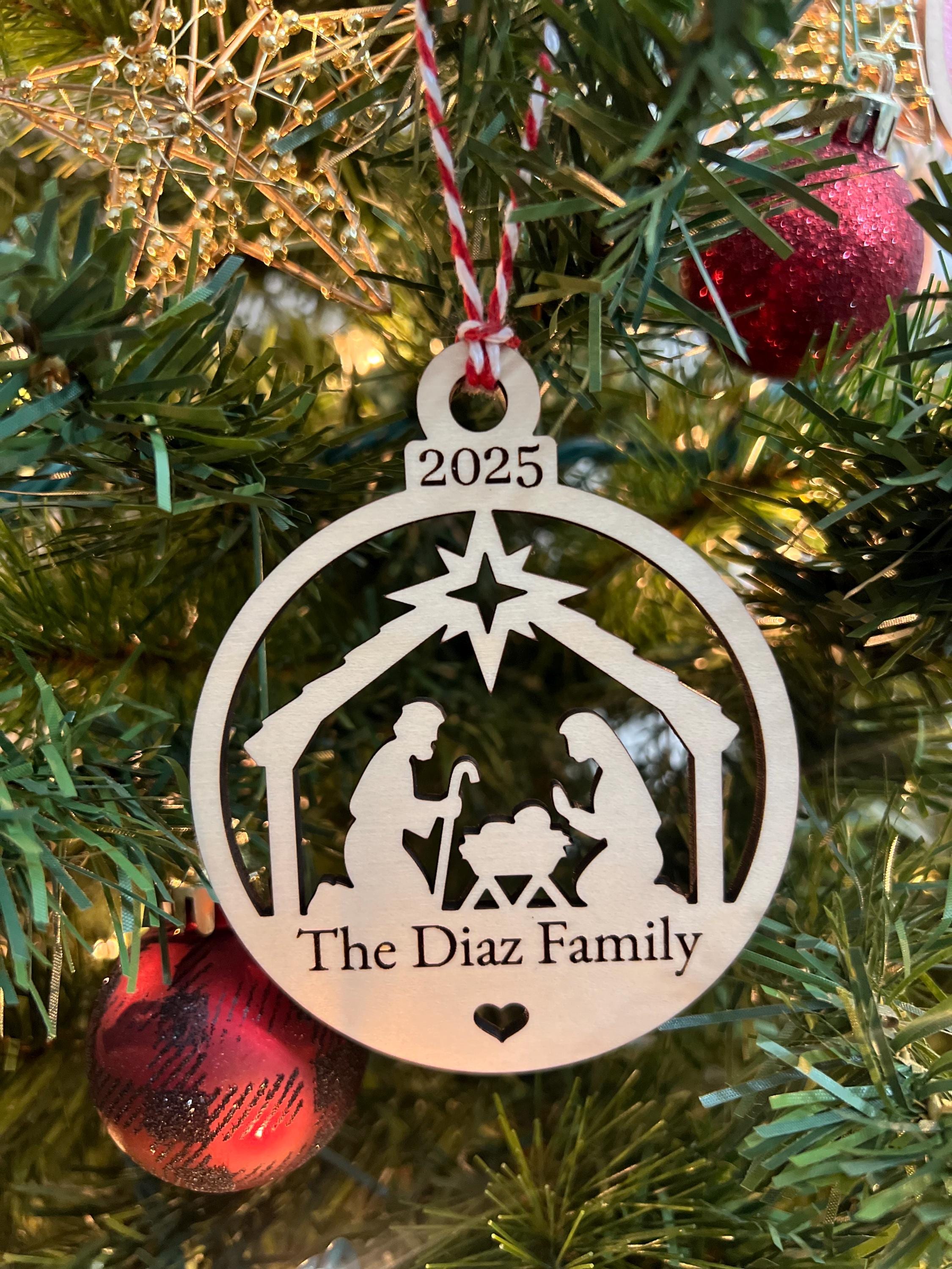 Wooden Personalized Nativity Christmas Tree ornament, personalized with name. Makes a great gift tag turned keepsake ornament for your loved one. Measures 3.5h x 2.9w inches.