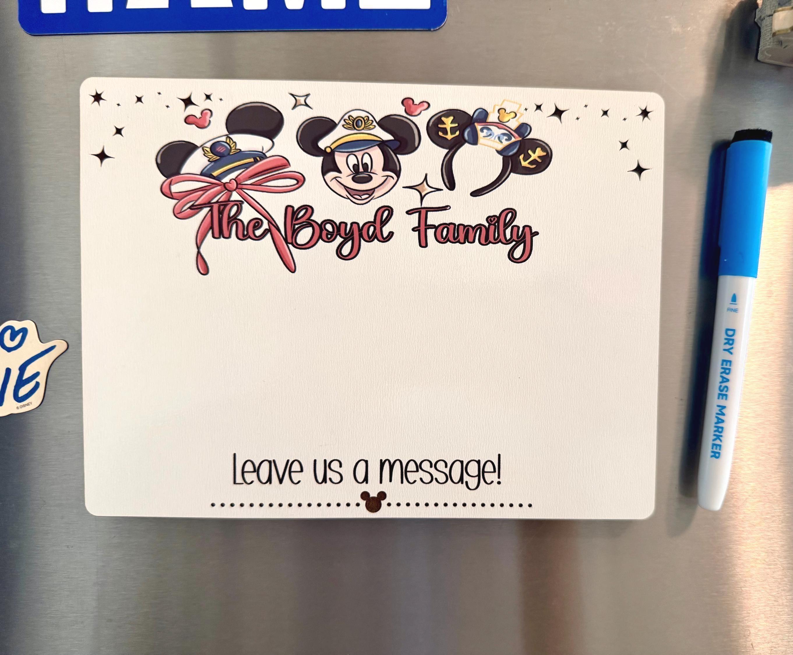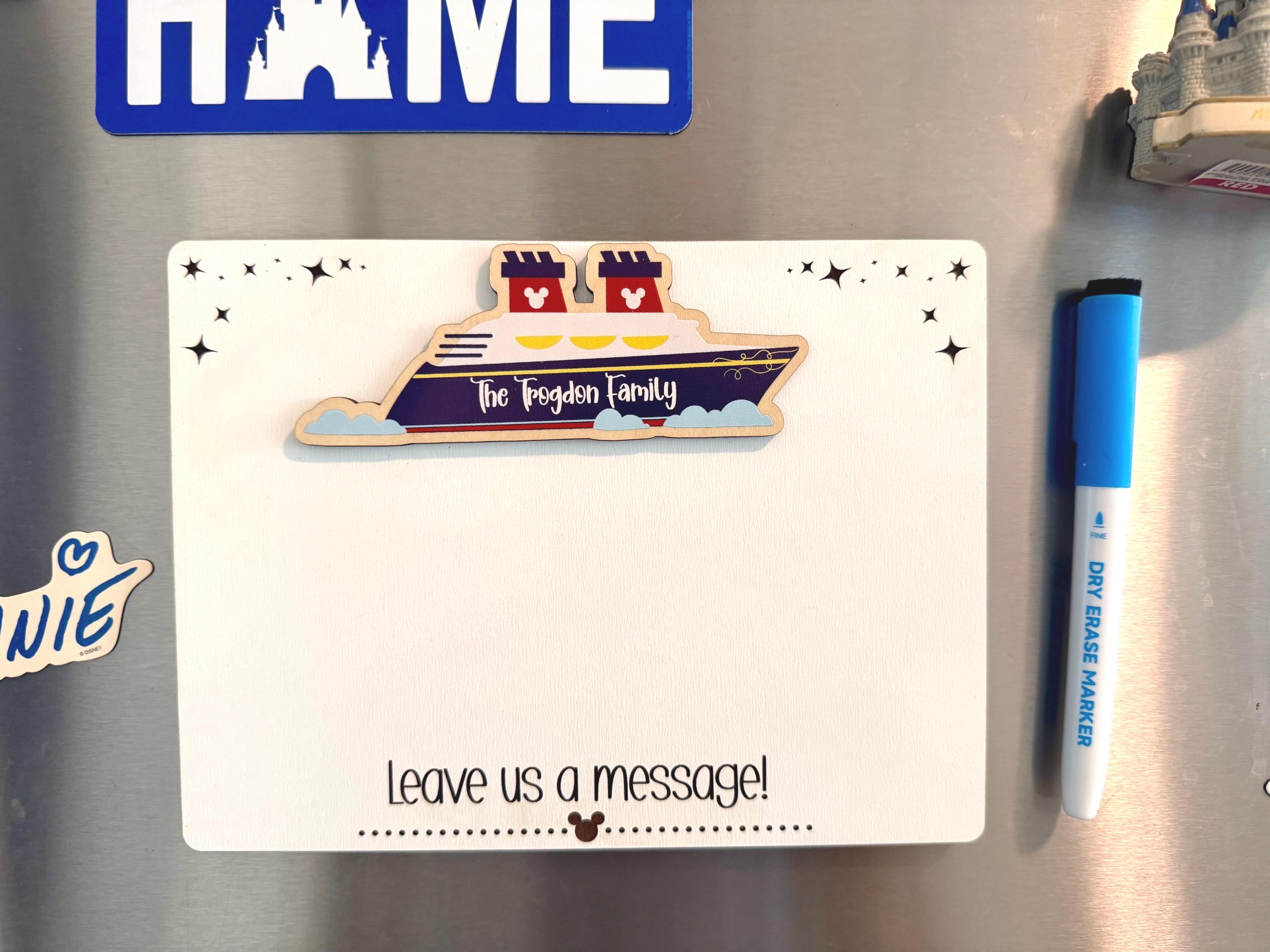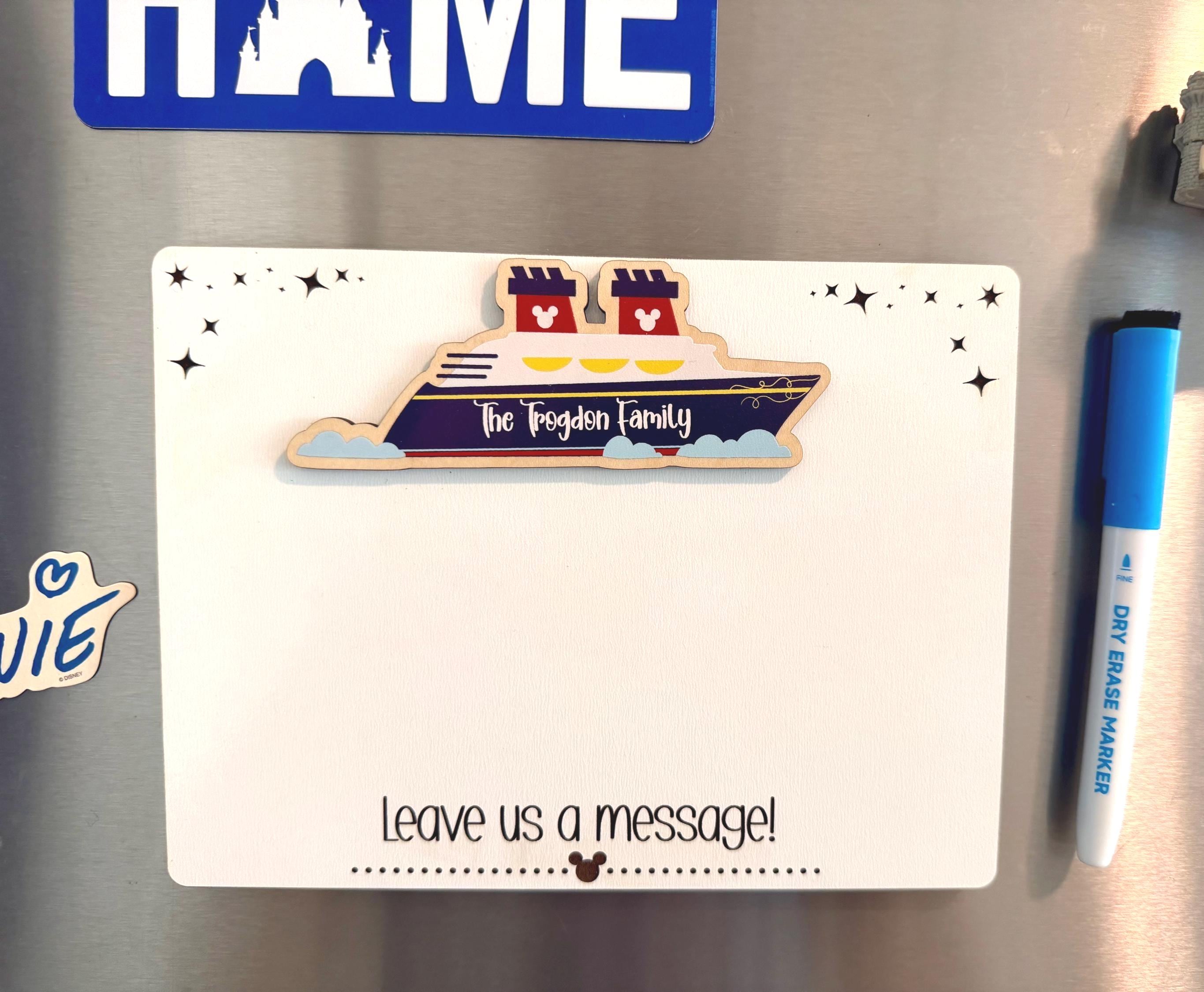 The perfect little message board for anyone headed on a magical cruise! This laser-engraved glossy white wood sign features a personalized wooden ship or fun cruise themed cartoon print.